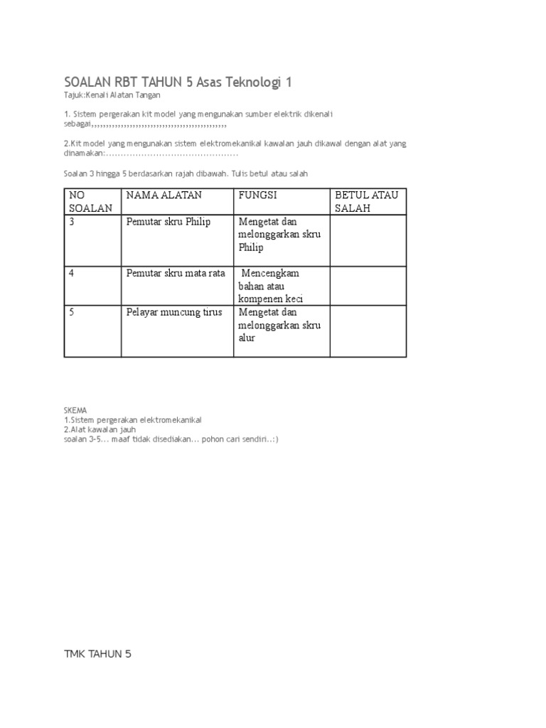 . Soalan latihan rbt tahun 5 by mat6not6ibrahim. RBT TAHUN 5 Presented by Cikgu Amin for RBT Tahun 5 Kit Model Kereta ASAS TEKNOLOGI Jenis Alatan Tangan Alatan Tangan Nama dan fungsi alatan tangan yang diperlukan untuk memasang dan membuka kit model. Soalan Rbt Tahun 5 Asas Teknologi 1.